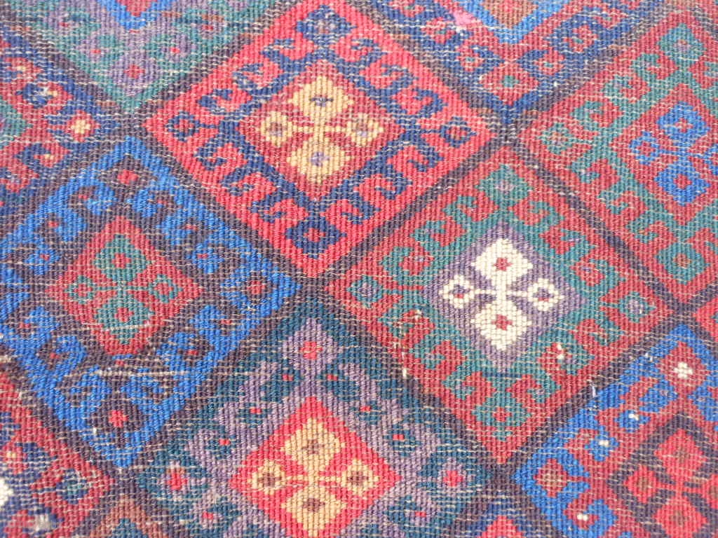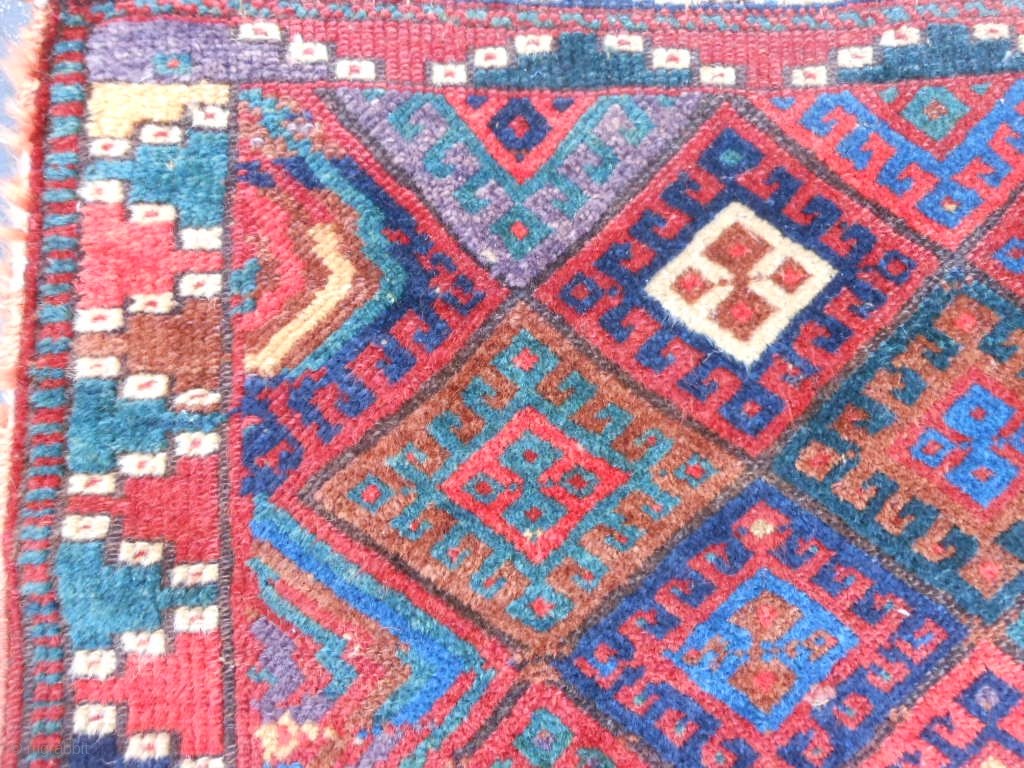 Persian Jaf Kurd bag, late 19th century, 2-6 x 3 (.76 x .91), saturated colors, good pile, rug was hand washed, one inch hole, 6 tiny holes, no rot, super purple, plus shipping.