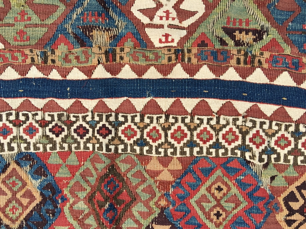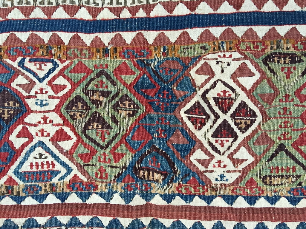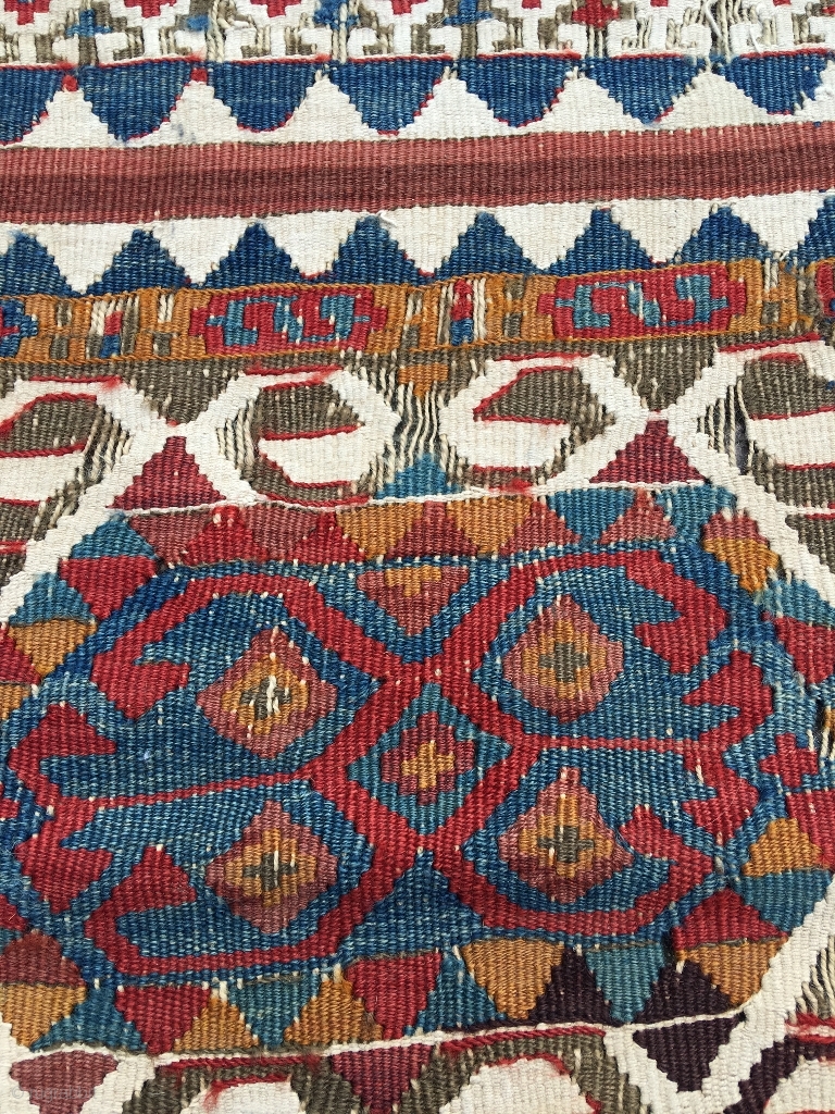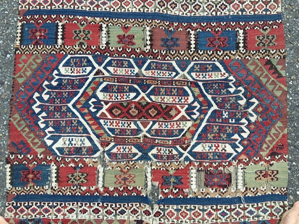Malatya kilim, nice and old, first half 19th century. Excellent colors, many interesting details in the free flowing drawing. White is cotton. Some wear, good condition for the age. Size 141.3 x 35 inch (359 x 89 cm).