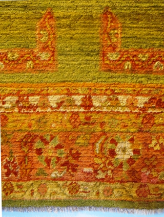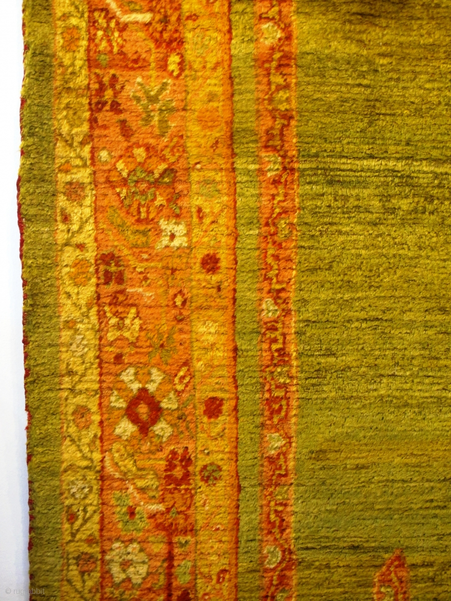 19th century Ushak Prayer Rug 2.14m x 1.23m (7'1" x 4'), wonderful fleecy Angora wool, silky texture. Great architectural drawing with inscription above the cartouche. Very good condition, with very minor restoration. Original sides and ends. This piece has been cherished through the generations. Beautiful abrashed green field, draws the viewer in, ideal for contemplation about the infinite...