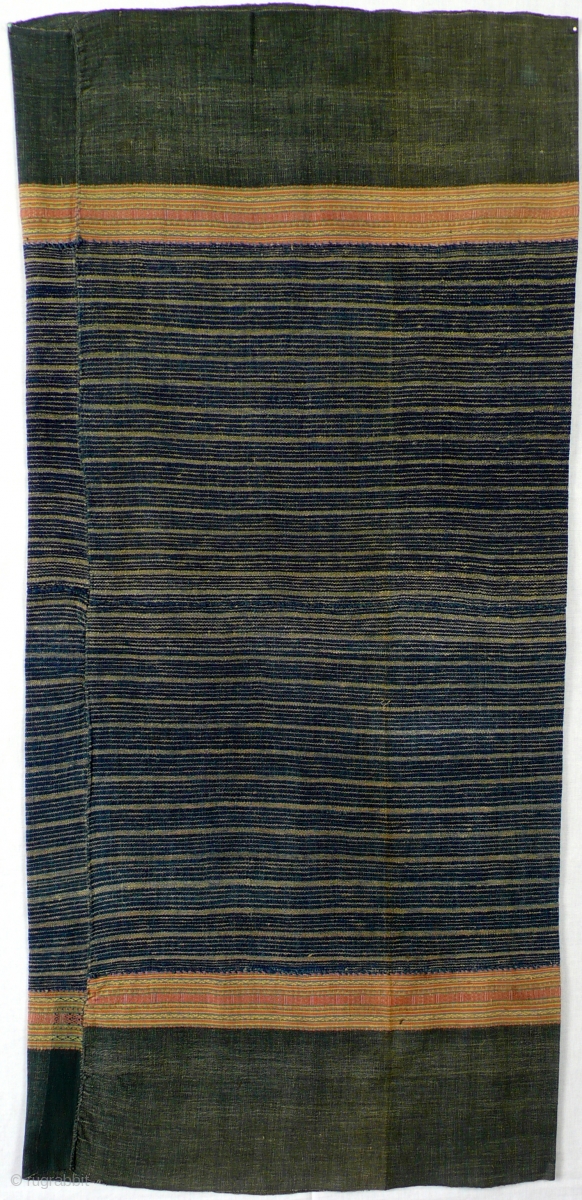 Handspun, handwoven cotton, indigo dyed, 4 panels, minimalistic design with plain off white stripes, complementary warp stripes in light colours on both sides.