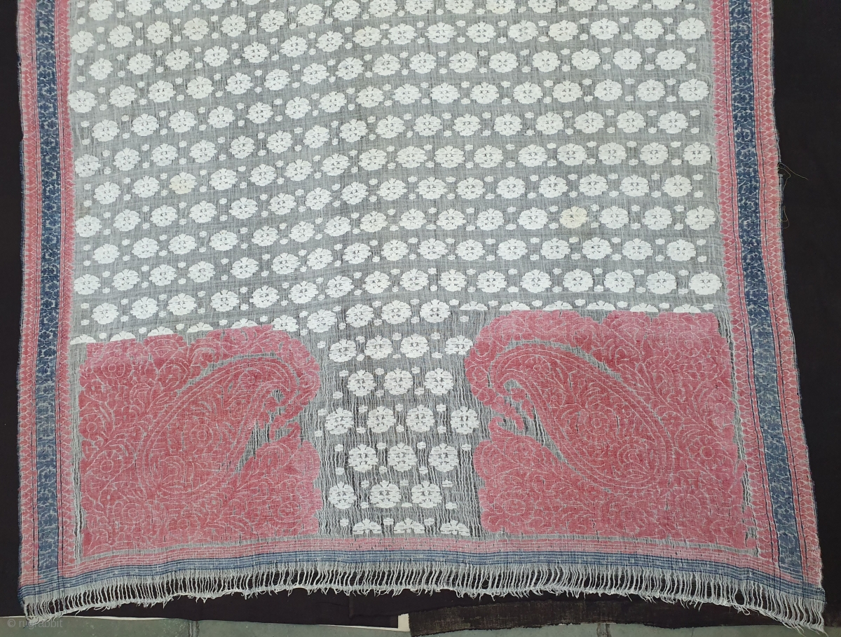Jamdani Finest Muslin Cotton Saree,With Double Pallu,From Dhaka District of Bangladesh.North-East India.India.Jamdani was originally known as Dhakai named after the city of Dhaka, Jamdani is Persian deriving name from 'Jam', meaning flower, and 'Dani', a vase or a container, named after decorative floral patterns found on Dhakai textile. Jamdanis are popularly known as Dhakai Jamdani or simply Dhakai. Its size is 102X440cm (20191106_123632).
