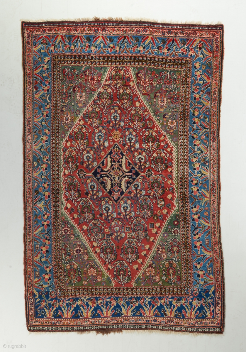 a gorgeous and rare Kahskuli Qashqai in near perfect condition. Late 19th century . Has a bit of artificial dye at the top. Not the finest type for a Kashkuli but very supple unlike some of the lower quality later ones. Great color, drawing and wool with a mughal inspired border. 5'7" x 3'7".