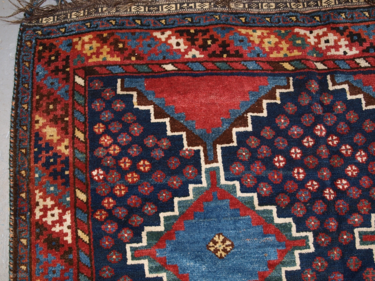 The rug has slight wear with good pile, the wool quality and colours are outstanding. The rug is also of a very useful size being slightly larger than normal.