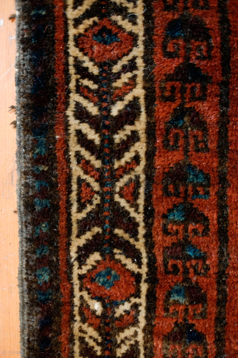 Baluch Bagface, possibly Adraskan area of Western Afghanistan. Late 19th Century. Beautiful leaf and tree of life design. The pile is full and the colors are deep and dark. It has a good amount of purple. There is a bit of damage on the right side selvedge. Otherwise it has a terrific graffic. Reasonably priced. 70 x 75 cm.