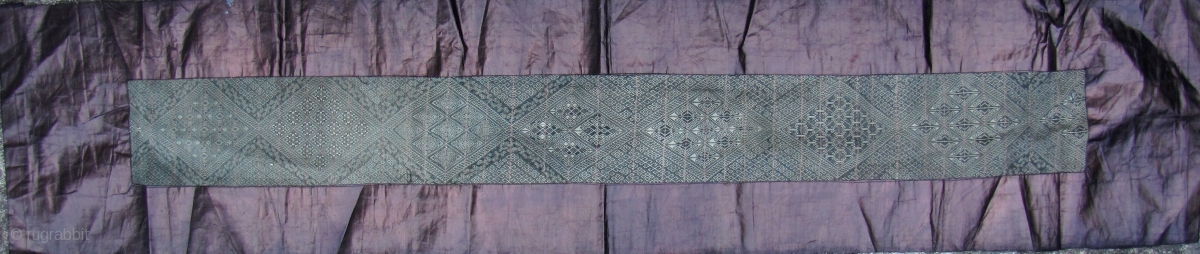 Fine and rare early 20th century Miao baby carrying strap from Zhouxi, Guizhou China. Please note that every diamond shaped medallion pattern is different. This is woven from all handspun silk warp and cotton weft. This is an incredibly labor intensive weaving process, in the old days, a skilled craftswomen could only weave about 1 centimeter a day, today no one is able to duplicate this. Total length of the brocaded panel is 134cm/52in and w: 16cm/6.5in. i had a contemporary “mud cloth” border sewn on. There is one small hole at one end, consisting of broken warp threads with intact weft. i put a single grain of rice in the last enlargement to emphasize the fineness of this weave. Please visit link to view full set of enlargements.