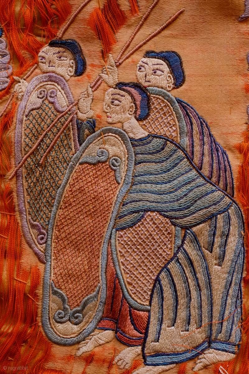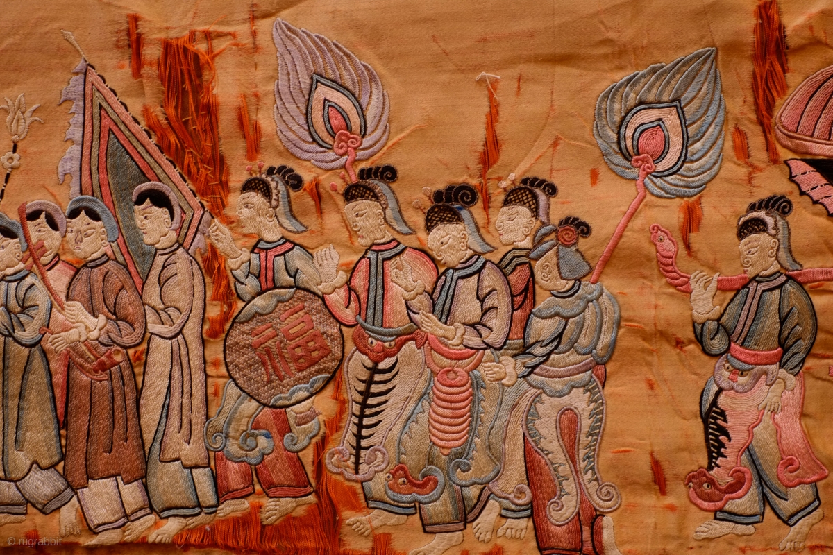 Qing Era 19th Century Embroidery Panel. Silk on silk. Very meticulously and precisely executed embroidery of very high quality. The scene appears to be of a wedding procession of an important bride to be. There is some discoloration in the ground silk and a good deal of wear but the embroidery is completely intact. Extraordinary and unique. 61 x 209 cm