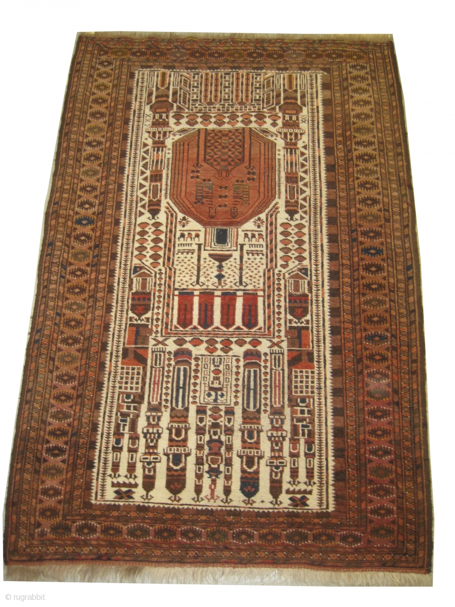 Both edges are finished with 2cm kelim, the surrounded large border is rust the background is ivory and designed with Islamic culture, fine knotted, in good condition, soft, in its original shape, rare example.