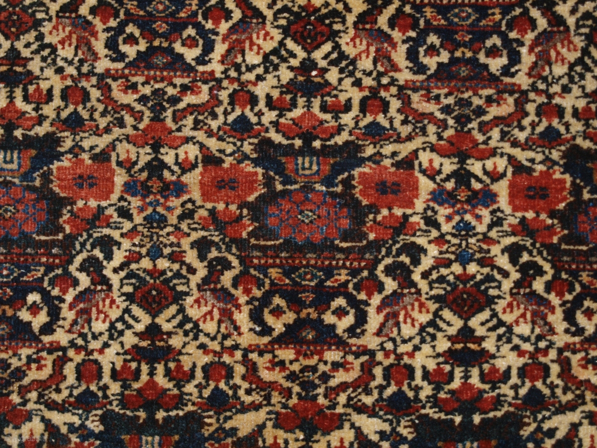 The rug is of fine weave and an excellent example of type, the border design is unusual for this design of rug, the simple red ground with pomegranate flowers is usually associated with the earliest examples. Note all the small birds in the field design surrounding the vases of flowers.