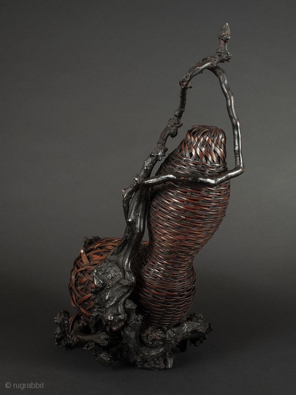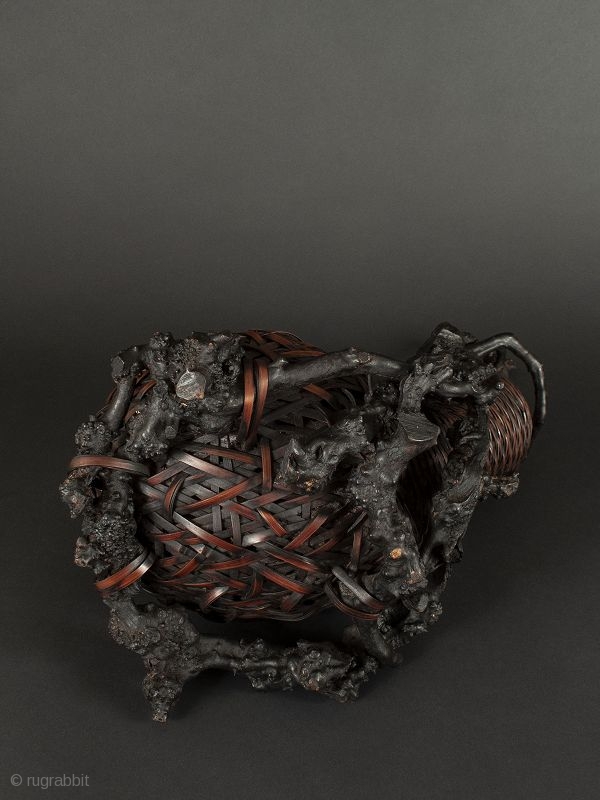 Japanese bamboo and wisteria branch gourd-shaped basket, beautifully woven, with open container for holding floral arrangement at largest node. wisteria branch base.