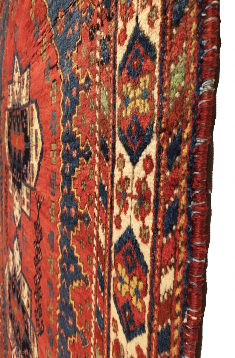 Antique Afshar Rug. Circa 1900. The design exhibits dual ‘ashik tipped’ medallions on a saturated madder red field. Mint condition. 9 colors. 4’10” x 6’4”. Delicately hand washed.