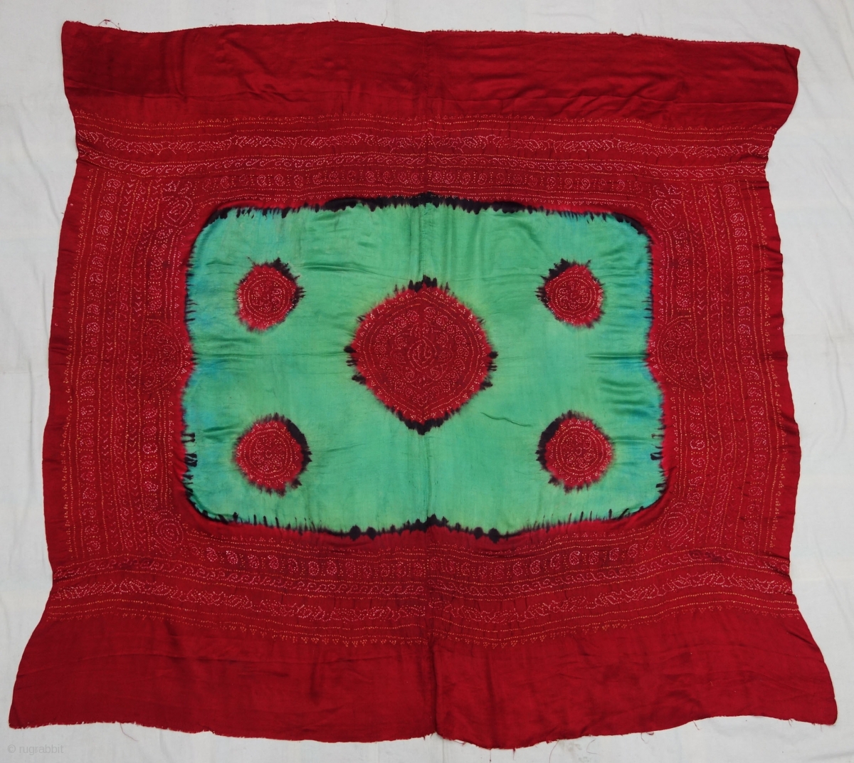 Ceremonial Tie and Dye Odhani known as Kumbhi,Tie and Dye Work on the Gajji-Silk From Kutch Region of Gujarat, India. c.1900. Its size is 155cmX160cm. This were Traditionally used mainly by Muslim Khatri community in Kutch, specifically to the town of Abdasa Kutch Gujarat(DSC07582).