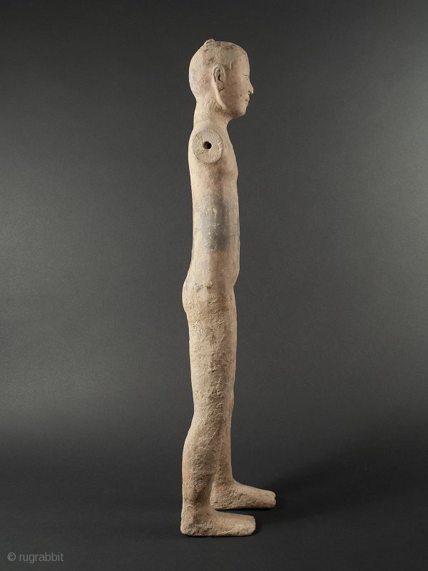Terracotta soldier, nude standing upright without arms, with insertion holes at sides. Red pigment on back of head and lower leg, black pigment at back of head. Remnants of dirt lightly attached overall. Size: 24" h 4" d 4" w