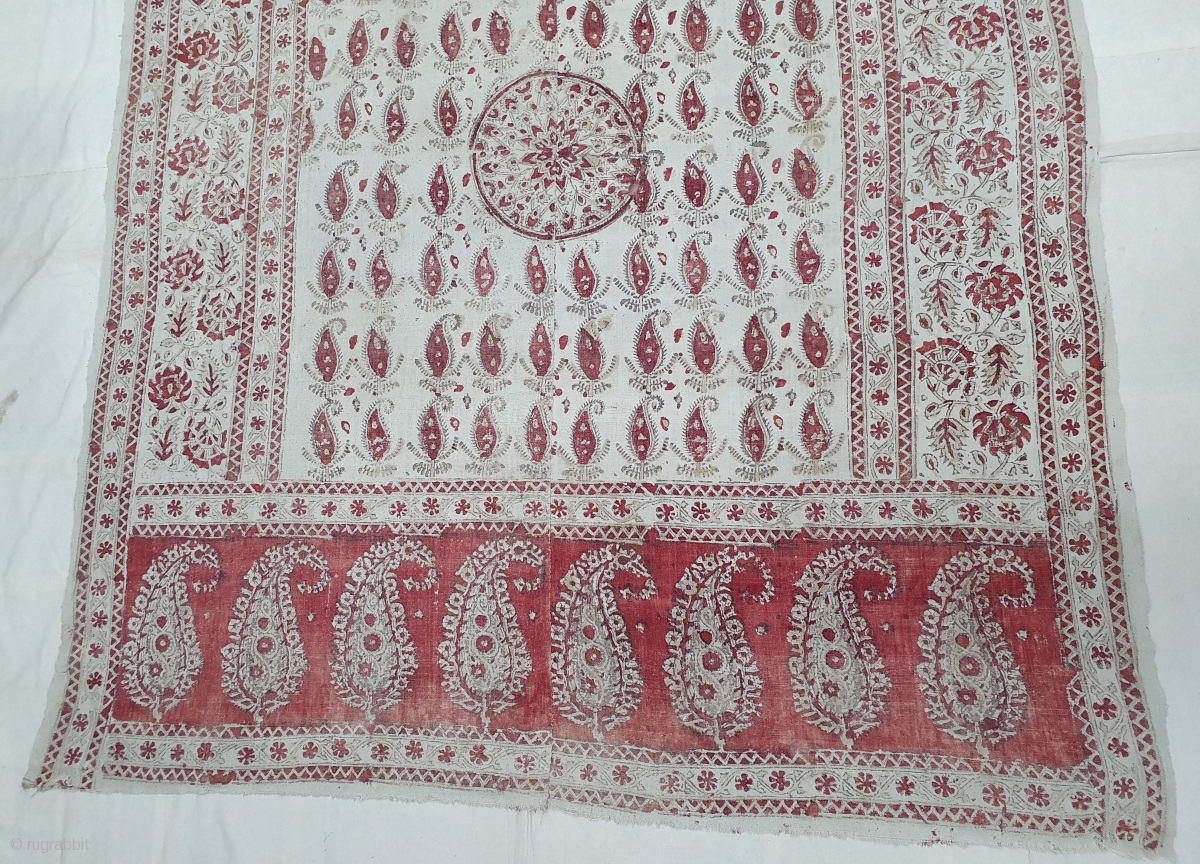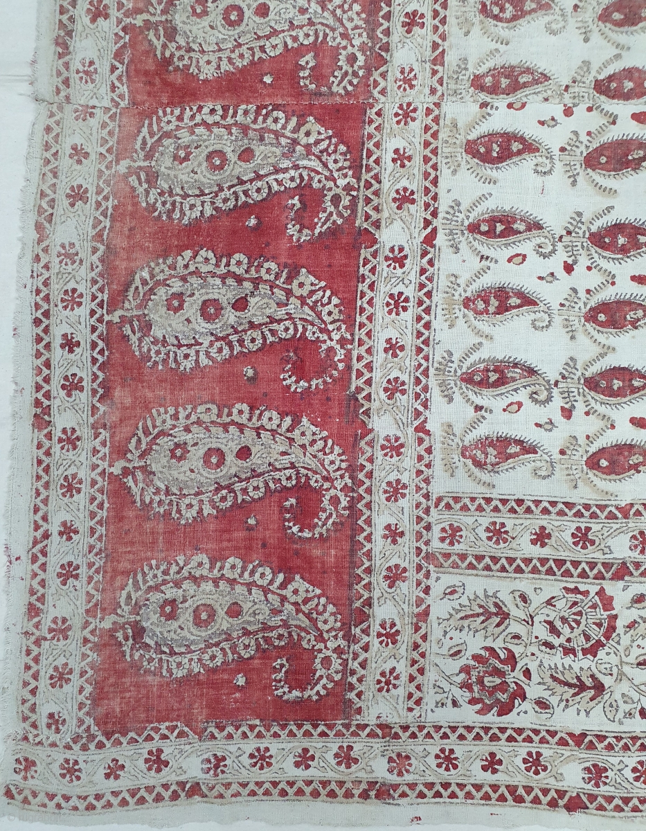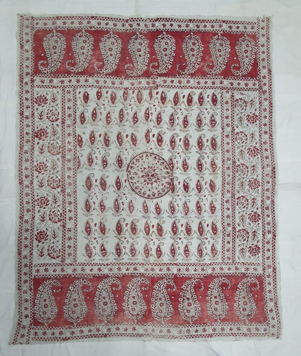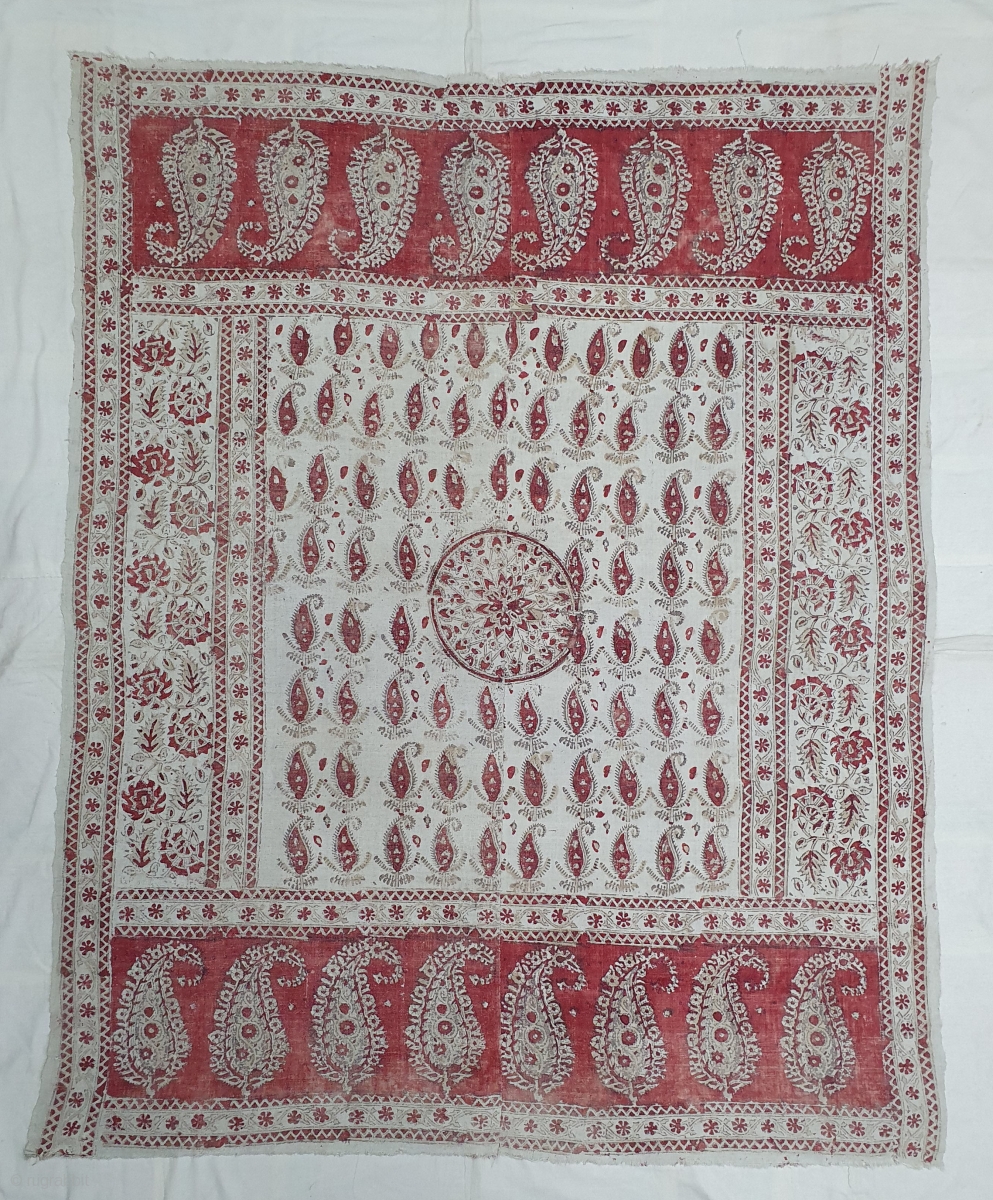 Kalamkari from South India. India. Made for Export Market, Printed on Khadi Thick cotton with Kery Design, Late 19th Early 20th Century. Its size is 142cmX180cm (20200304_143159).