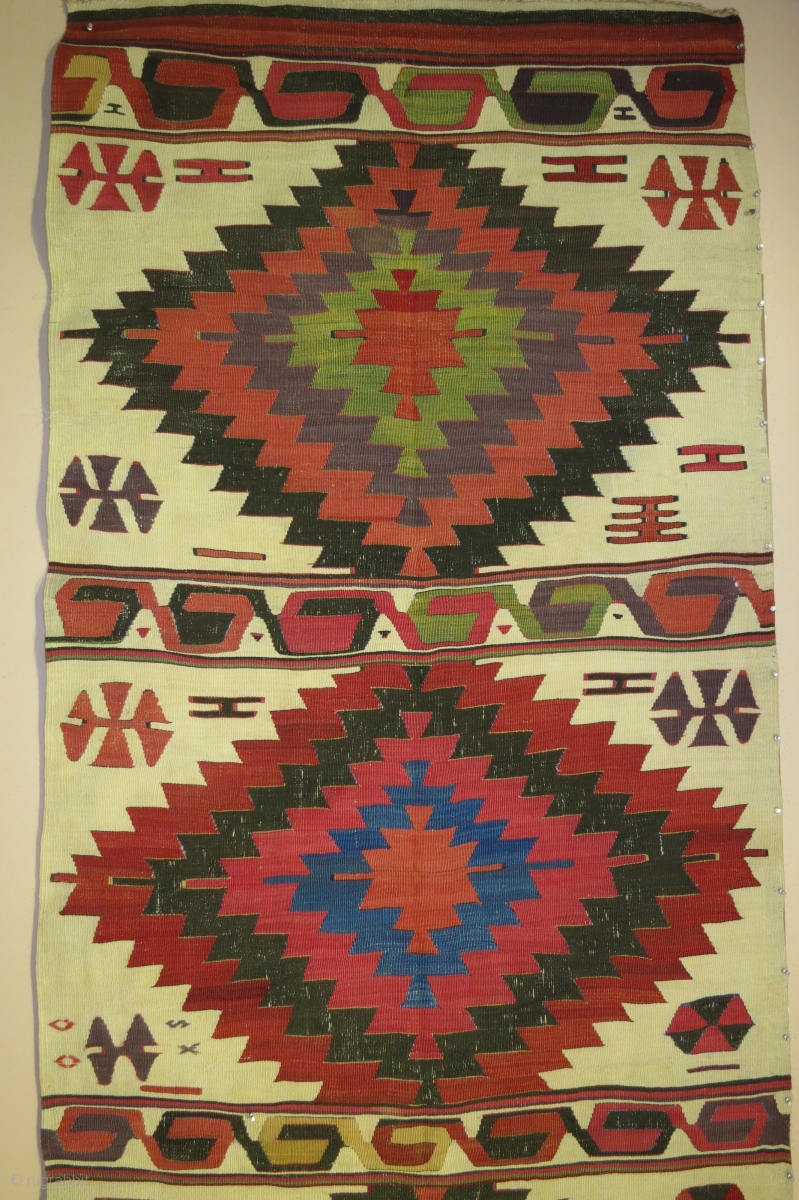 4 Medallion kilim, Central Anatolia, 132 x 418 cm, circa 1800. This kilim has survived in extraordinary condition. It seems likely that it was donated to a mosque shortly after it was made, was subsequently never used and kept in a storage depot. The only losses in the kilim arise simply from contact with air, humidity, and temperature, causing some of the black dyed yarns to corrode away. the corroded black areas have been restored.