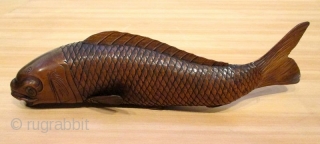 Antique Japanese boxwood okimono of swimming carp fish with sinuously shaped body and realistically carved scales and details. Lovely soft patina of golden brown color. Good condition.