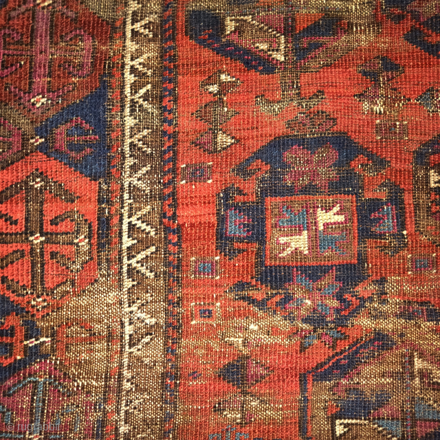 Worn and whipped and very rare red-ground Timuri type Baluch rug with a Saryk border. Madder red ground with cochineal highlights. Squarish shape.An old and significant piece despite condition