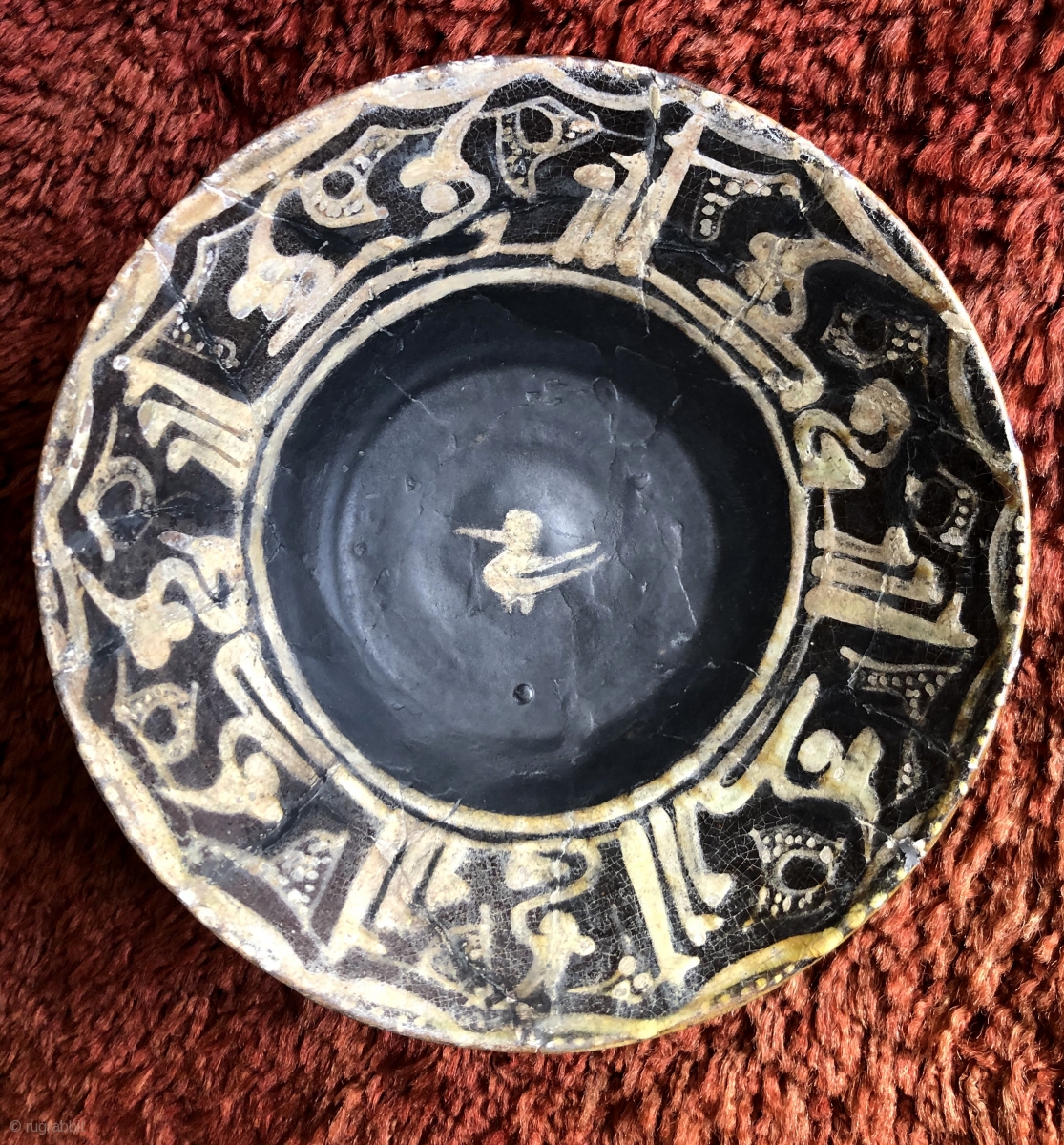 Nishapur Ceramic bowl. North East Iran, 10th century. Size: 8 x 2.5 inches (20.5cm x 6cm) Stylized bird design in center with Kufic inscription band on rim and sparse, simple decoration on outside of bowl.Repaired/conserved over 30 years ago.