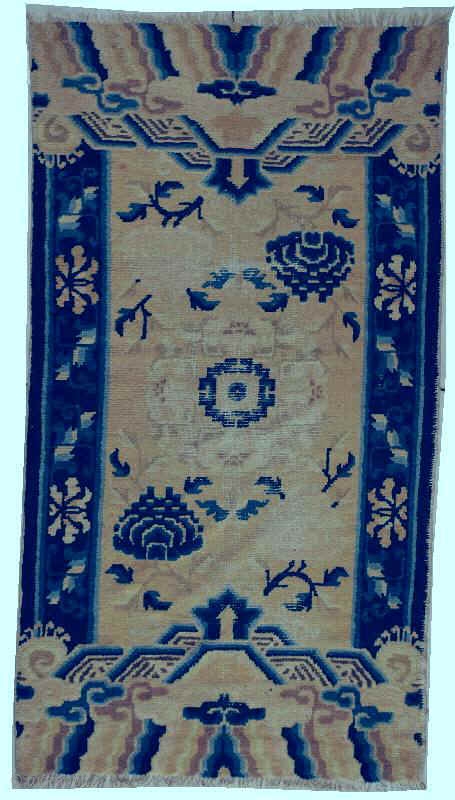 This circa 1800 Ningxia antique Chinese Oriental Carpet measures 2’11” x 5’2”. It has a center medallion in ivory with a blue center with either blue or pink chrysanthemums in the corners of the field. There are flower sprigs in pale yellow and two shades of blue. The medallion is flanked by two butterflies all on a fabulously clear yellow field. There is a wave border at each end. There is some wear in the field of the rug commensurate with it’s age. The rug is clean and ready to go. The buyer pays the shipping and insurance.