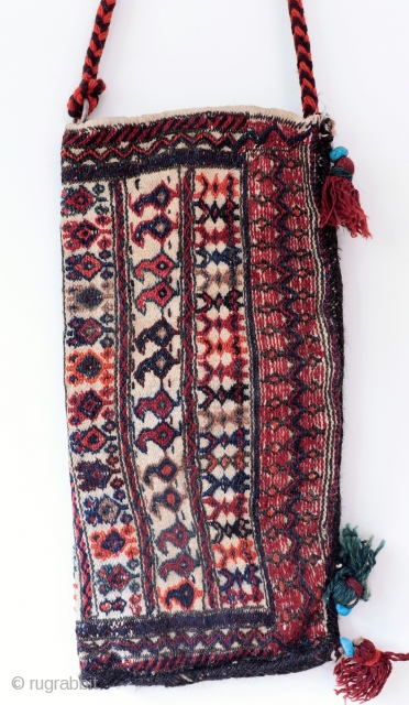a Bakhtiari spindle bag. In many cases spindle bags are woven in one piece and folded over widthwise , as is the case in the present bag. All natural dyes, in mint condition, including some ceramic blue beads for protection against evil eye. (at1807065), 46x22 cms.