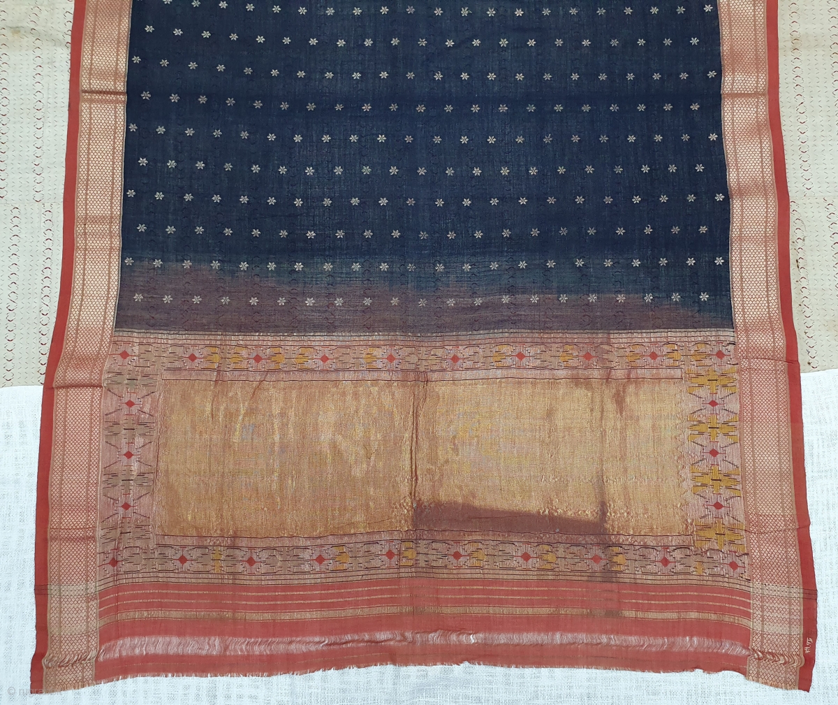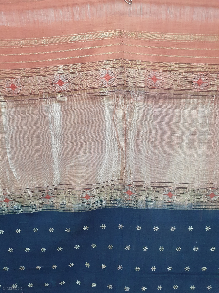Paithani Shalu Sari Double Pallu (Pallov)with indigo Blue colour middle, Its characterised by borders of an oblique square design, and a two pallu design,It’s an Cotton and zari weave sari, with makers signature on it. This type of sari is named after the Paithan town in Aurangabad Maharashtra state of India. India.C.1900.Made from very fine Cotton,its size is 118cmX365cm Rare type of sari(20200715_150652).