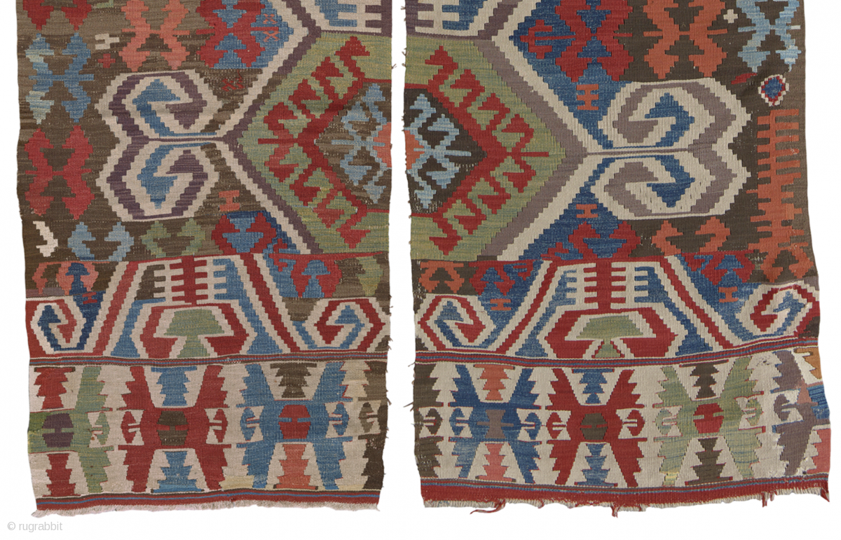 A two parts tribal flatweave from central Anatolia in great natural dies colours. One stripe is complete and in a good condition, with some old restorations. The other one is just a fragment. The all over ram's horn motifs symbolise fertility and power.