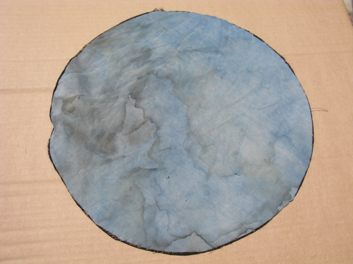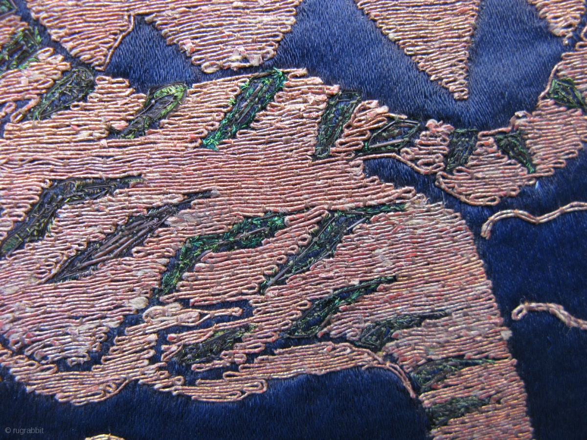 Antique Chinese embroidered roundel, fine couching of metal threads and peacock feathers on blue silk, originally the flying tiger emblem was used on military banners in the 17th and 18th centuries, this example was made in the early 20thC and most likely an item made for sale, and not for use by the current military, it is of very high quality using several colors of metal threads, and peacock feathers spun into filaments, the approximate size is 11 inches across, there are some loose threads, the the outer border is very worn, and proably recycled from a 19thC robe, it is backed with light blue silk that has water stains, also probably recycled from an older textile #jr-1, shipping is extra