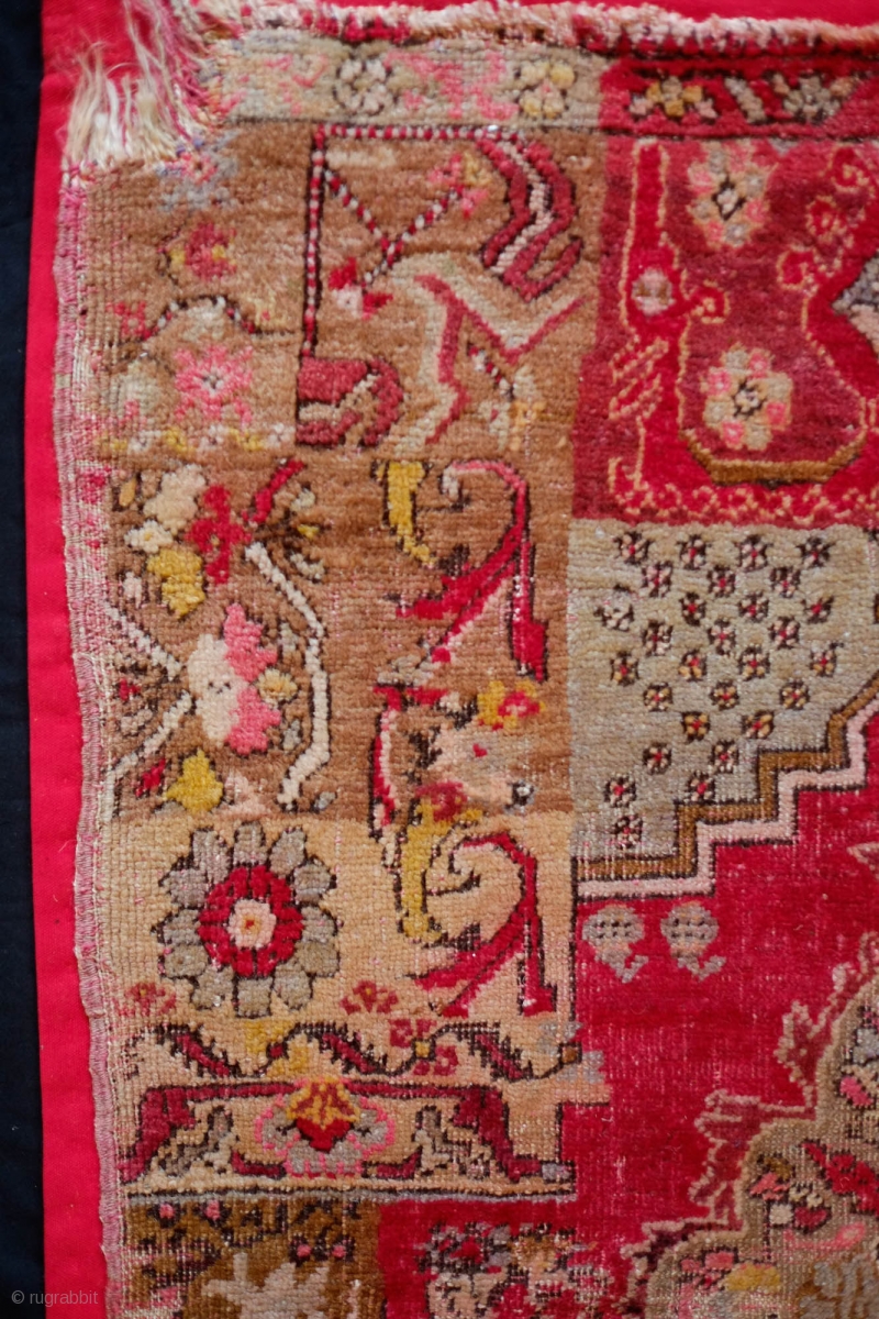 Mudjur-Kirsehir Prayer Rug Sampler/Wagireh, Mid-20th Century. It has a tear down the middle but has been mounted on a thick red cotton fabric. The wool is of excellent quality. Not the oldest but a wonderful example demonstrating how rugs were reproduced in a workshop setting. 83 x 131 cm