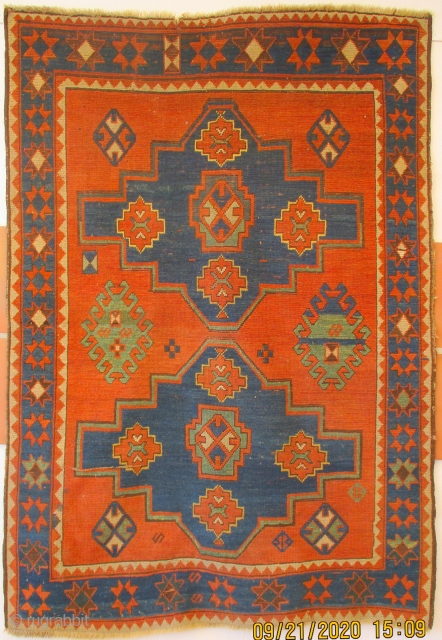 antique caucasian kazak rug dating from the pre - Soviet era. It has a pleasing simplistic design of two medallions in the field which are surounded by randomised floral and leaf motifs. The pile is low all over and the sides have been re-overcast. Use it as a throw, cover for a table or bench or a quiet place on the floor. Freshly hand washed and ready for the next decades. Reference 3216. Size 172 x 116 cms., or 5ft. 8ins. x 3ft. 10ins. Euros only 145. sold - thankyou