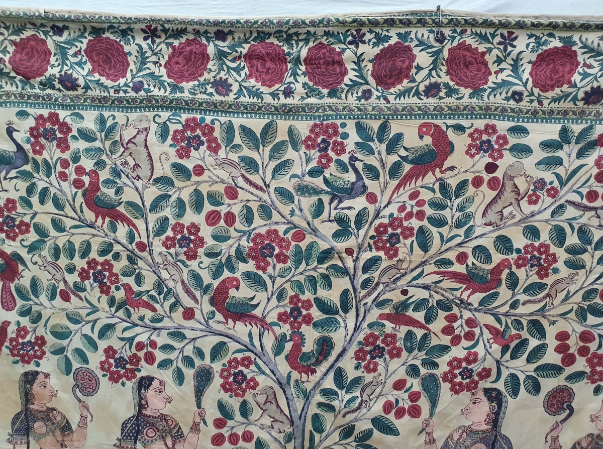 a Roller Print Pichwai depicting the Lord in the form of a tree with abundance and life. It's flanked by Gopis on both sides venerating the divine and the lower register shows cattle with their herders. The entire Pichwai is executed in fine Roller Print technique. Roller Print on the cotton, Its From Gujarat India. India.C.1900. Its size is 177cX177cm (20200919_152508).