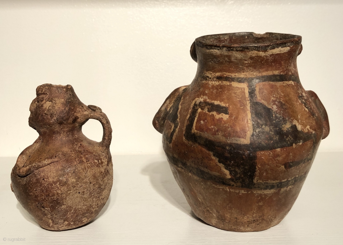 Arte Primitivo. Two Pre-Columbian ceramic effigy vessels from the South Central Andes. Of unknown origin, these vessels have a decidedly more primitive look that distinguishes them from other Lake Titicaca Basin ceramics. My estimation of age is speculative, but both likely pre-date the beginning of the second millennia a.d - the smaller one maybe by a lot??. The tallest figure with coffee bean shaped eyes has remnants of freely drawn black and white geometric decoration which is similar to some Altiplano region ceramics, but the coffee bean eyes are unusual. The smaller of the two vessels is plain and lacks painted decoration, but displays a prominent, erect phallus evoking generative powers. The clay of this pot shows fine, gold colored pyrite flecks throughout and it was relatively low fired. Size: 7 x 7 inches for the large figure 5 x 3.75 for the smaller.