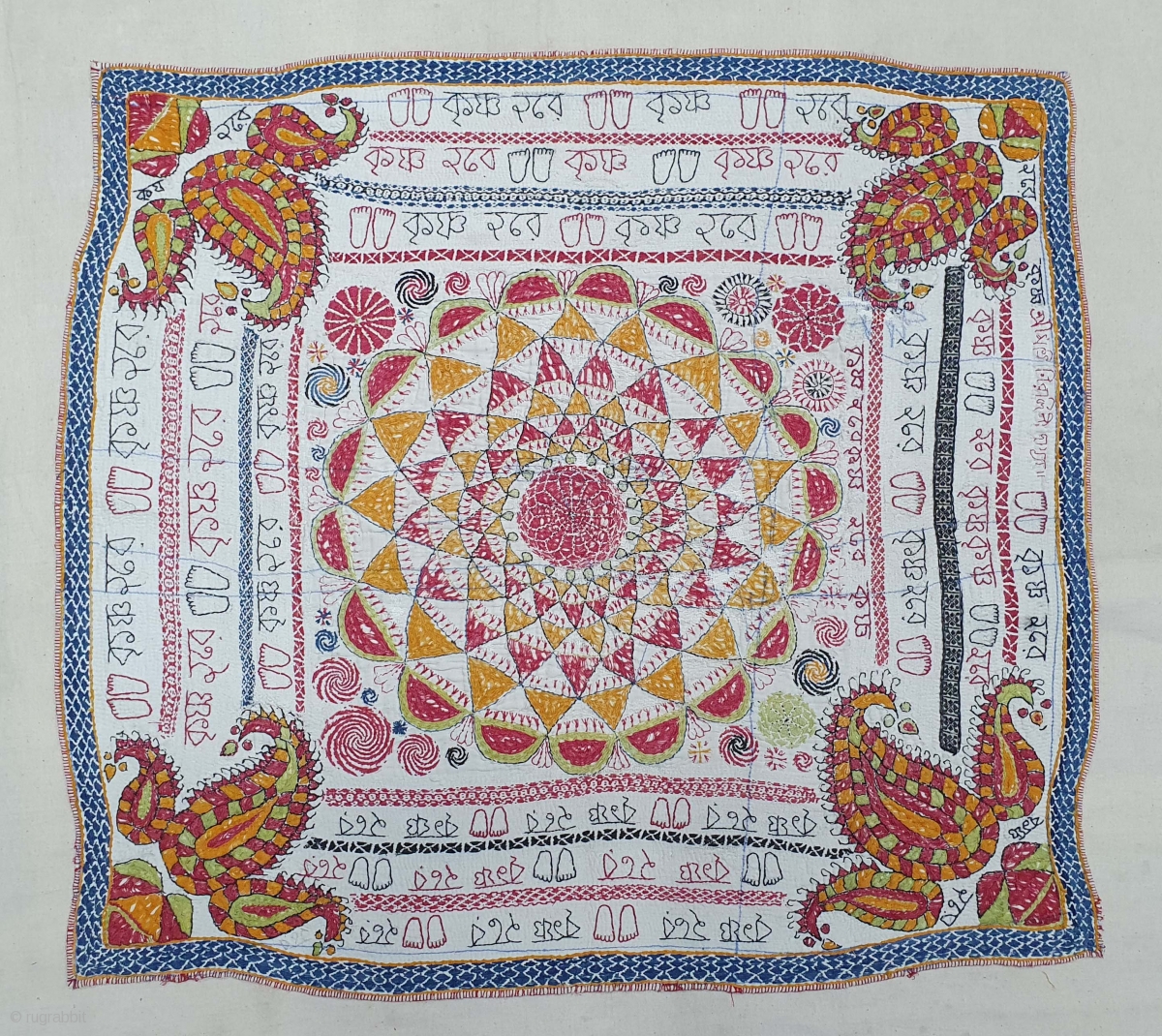 Rare calligraphy Kantha,(Mansion As Ram-Ram, Krishna-Krishna ,Hari-Hari)Quilted and embroidered on the cotton with cotton embroidery, Probably From Ramnagar District, West Bengal(India)Region. India.C.1900. Its size is 55cmX60cm(20201015_154852).
