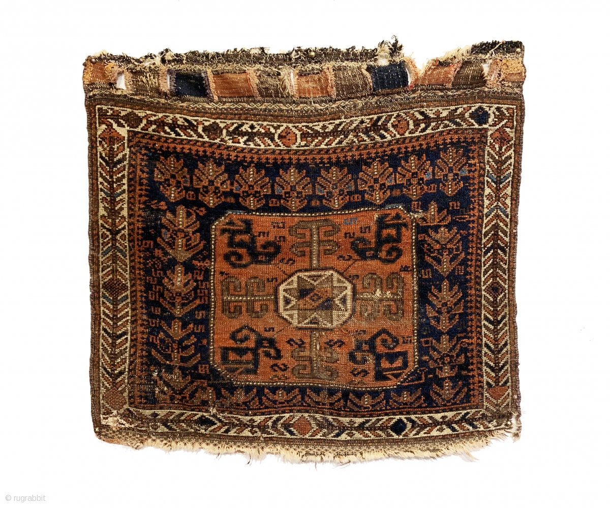Antique Baluch Bagface. Northeast Persia. 2nd Half 19th Century. Shrubs and s design on blue field surround Tukoman like Gol with quartered dragon elements. Interesting white ground border. Original condition. Nice wall hanging. 6 colors. 2’7” x 2’9”. Carefully hand washed.