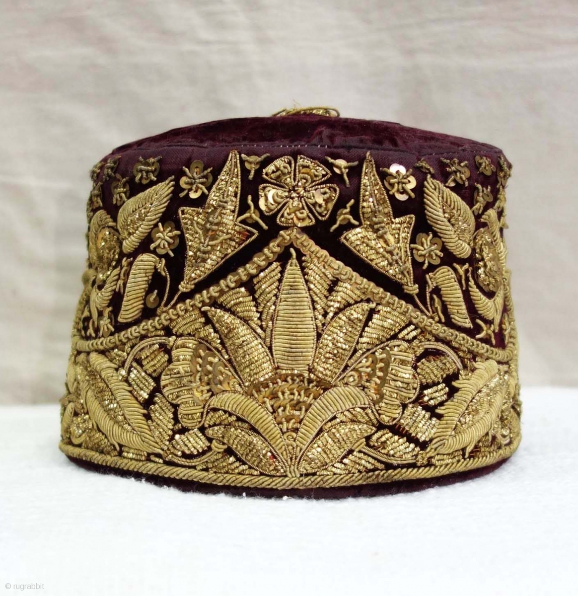 Parsi Topi (Hat) Zardozi Embroidered on cotton velvet, With Real Silver Thread with Gold Polish,From Surat, Gujarat, India. India.Late19th Century.
