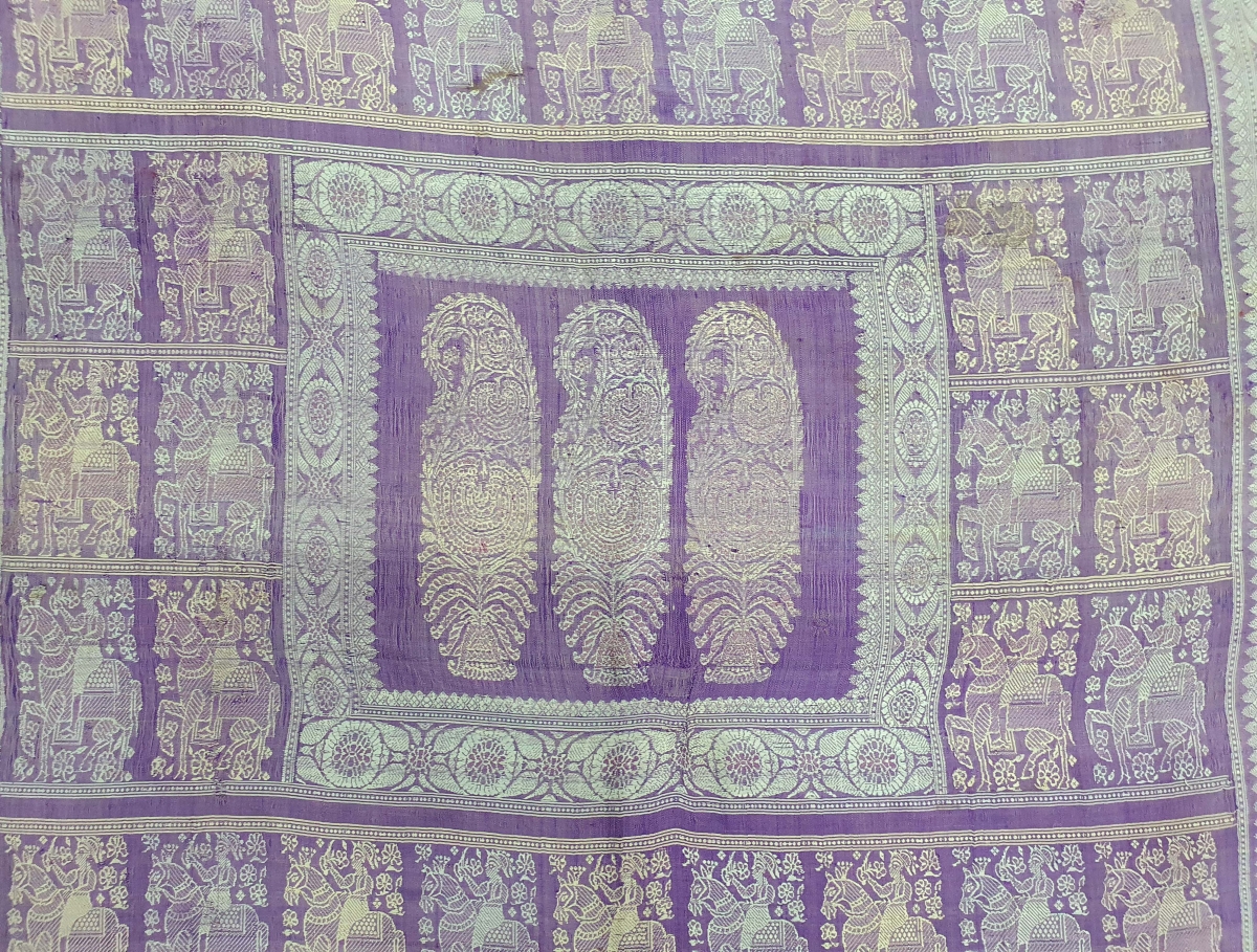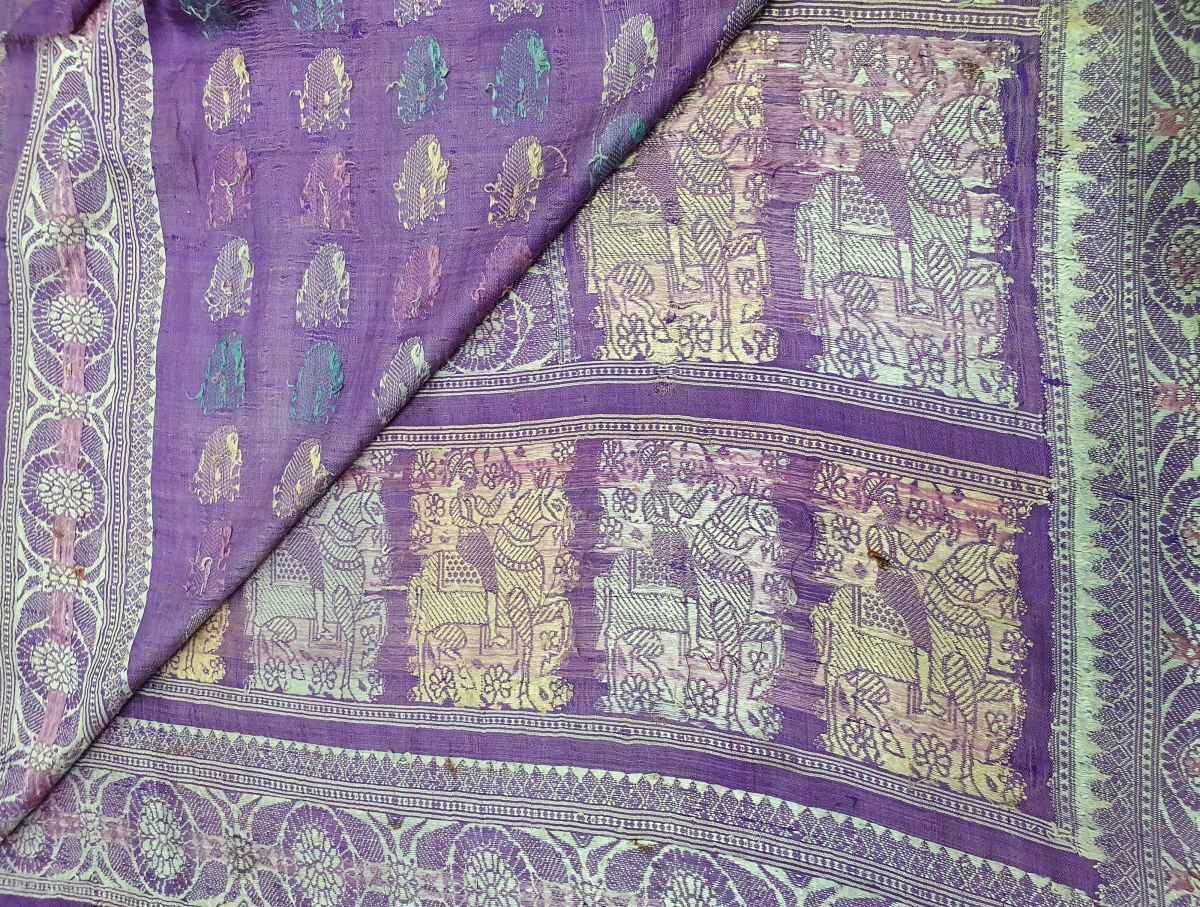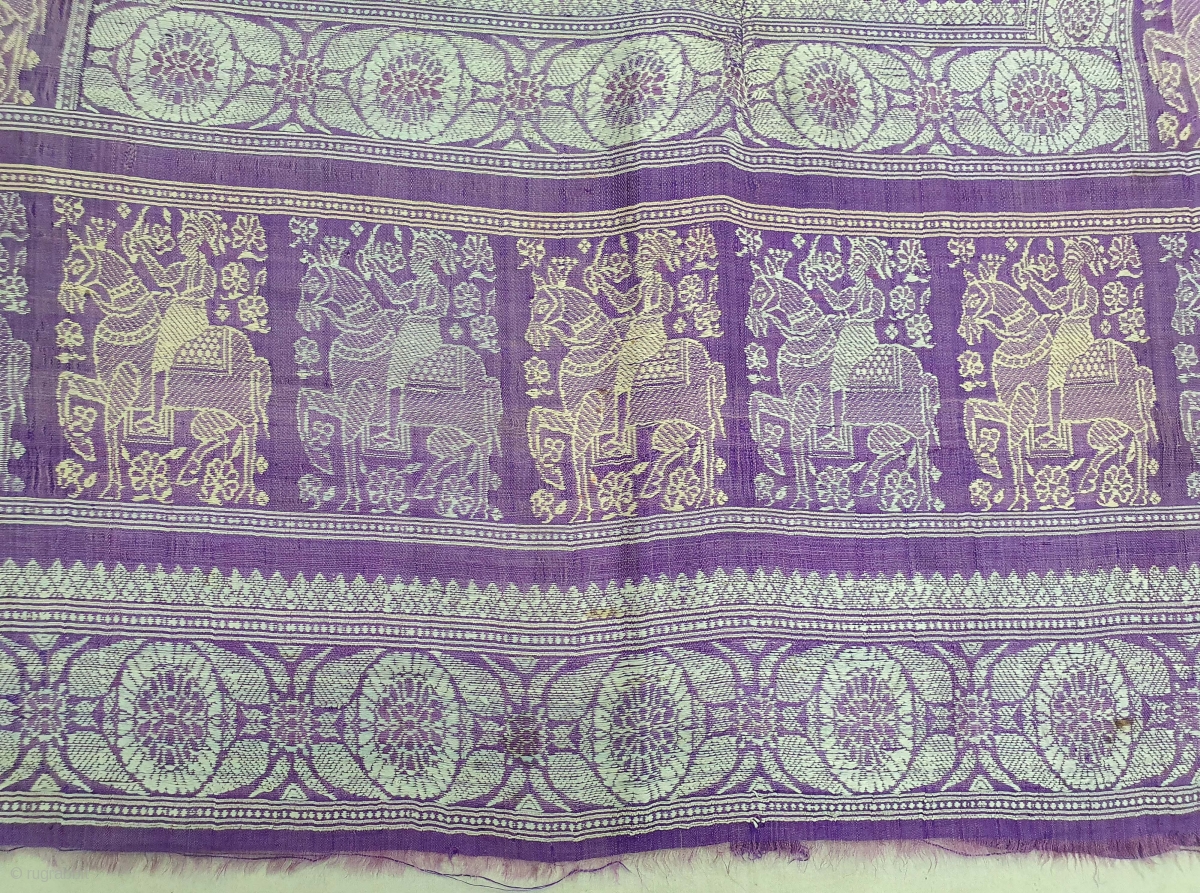 Baluchari Saree from Bengal, India. 19th Century. a procession with Horse and Nawabs becomes a motif for the saree. It was this unique human figure that made Baluchari so special. Baluchari is a type of sari worn by women across West Bengal and Bangladesh. This particular sari type originated in Bengal and is known for depictions of socio political themes and mythological scenes on the pallu of the sari. Produced mainly in Murshidabad. Its Size is 115cmX420cm(20201219_141827).