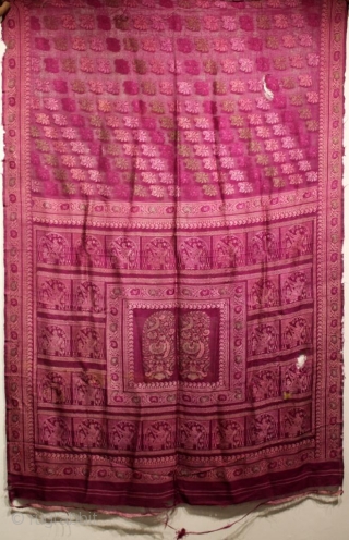 Fine quality baluchuri sari from West Bengal India 1900c. Lady with tambura in her hand a rare subject on pink color base with 2 mangos design in pallu the sari has 10-14 tiny holes and one large hole in pallu which is repairable and will be lined .the size is in full size of 446 cms in length.
