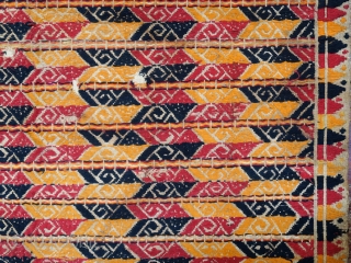 a large, festive tampan with a colourful geometric design of interlocking parallelograms in saffron yellow, deep indigo blue and true red, woven in supplementary silk weft over an undyed cotton base. Although the coloured threads cover the base in alternating blocks, the base exposed so as to as to form hooked lines within each unit. Framing every two rows are meandering lines in red, yellow and gold-wrapped threads that visually organize the two rows into bi-coloured chevrons reminiscent of the ships in the ship-cloths to which this piece belongs. At the sides, a row of triangles in the same colours echoes the centrefield design. Triple borders above and below in red band dotted with white flowers, a row of floral indigo motifs and a zigzag line add to the formality of the piece.