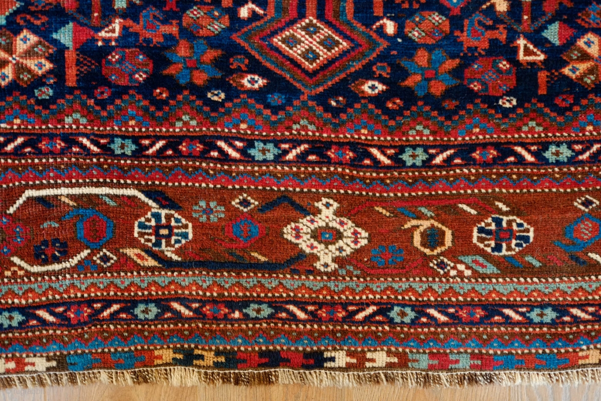 Khamseh Rug, Late 19th/early 20th Century. Fantastic deep indigo blue ground. Exceptional border. Natural colors. Possibly Arab Jabbareh group but the knots are symmetrical. 171 x 212 cm.