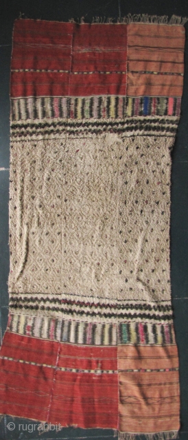Rawang Nung Blanket: Rare and unusual 3 paneled piled blanket from the Rawang ethnic group in the Kachin State, Burma. The ground is woven from hemp, the reddish head ends are dog hair. There are a few areas that have a bright colored commercial yarn but other than that, all natural dyes. In the red field there are some bits of missing weft noted in enlargements. This piece is circa 1950 (plus or minus), definitely old an old piece. The Rawang are an upland ethnic group living in some of the most remote areas of northernmost Burma. i acquired this about 20 years ago in Mae Sai, Northern, Thailand. Information on these is scant, but there is a decent write up on the textiles and baskets. Vol-37, number 3~ Arts of Asia. l : 1.98cm/79in and w: 78cm/31.5in.