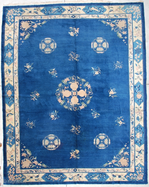 This Peking Chinese rug measures 9’2” x 11’8”. It has a medium blue field with a central medallion of four flowering urns coming together to form a wreath with their foliage. a single urn motif is worked in the corners complete with the same foliage. Each quadrant has a circle of lotus flowers facing each other in pale pink, gray, green and putty with touches of ivory. Sprigs of flowers are lightly scattered over the field. The ivory border is worked in a blue ground cartouche motif containing various bits of Buddhist iconographies such as the beribbon urn, chessboard, umbrella, conch shell, etc. The cartouches are separated with butterflies and birds. This rug is 99.5% full pile. The ends and sides are complete. It is clean and ready to go. This is a magnificent solid antique Chinese rug.