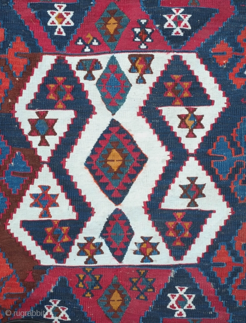Malatya Kilim, 19th Century. Deep, rich colors. Very saturated. It has a couple of small holes and a stain on the top section but otherwise in good condition for its age. a few small very well done repairs and very hard to find. 166 x 340 cm.