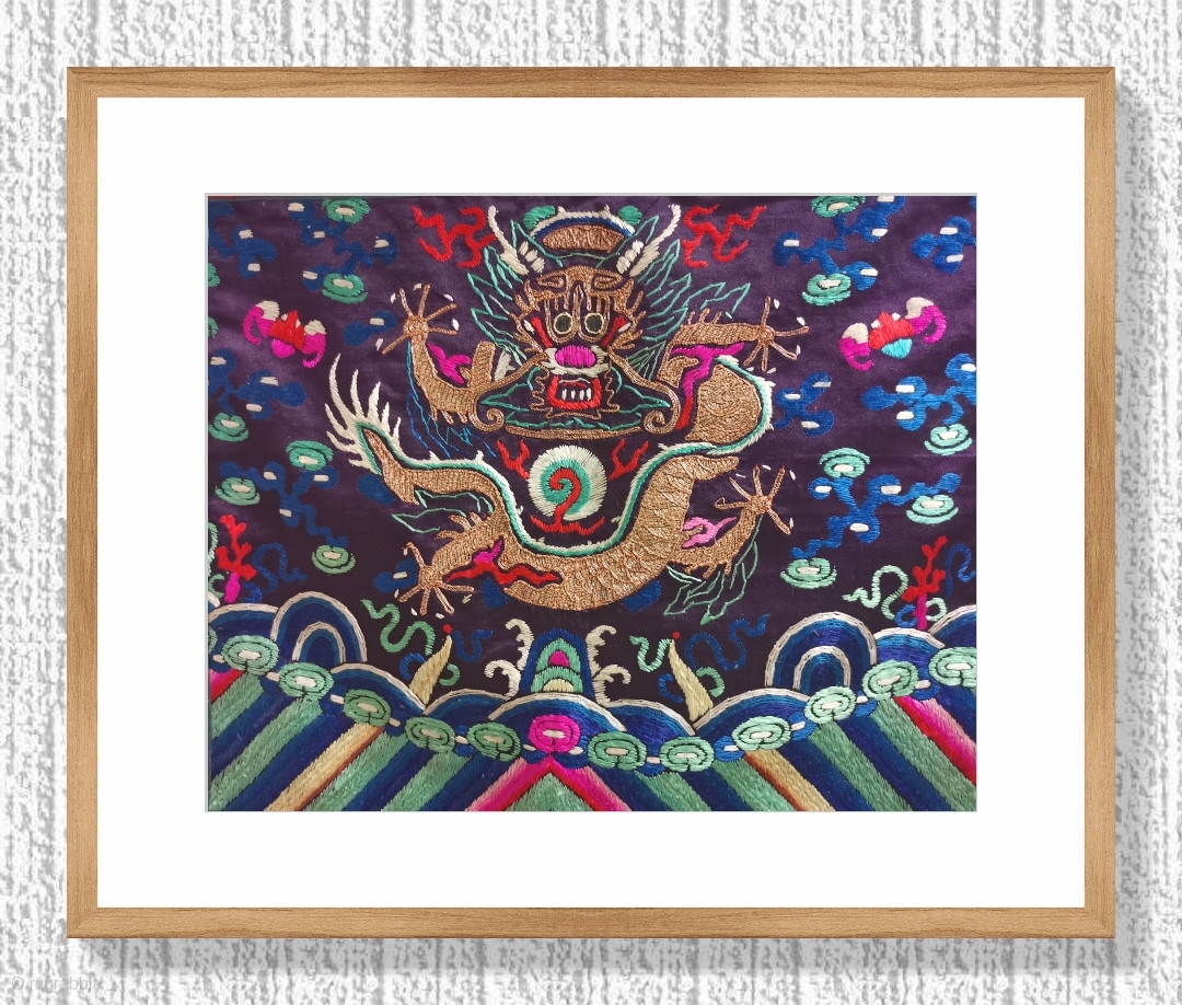 In the embroidery of the colorful Dragon Robe of the Qing Dynasty, a front five clawed dragon is embroidered with gold thread in the middle. Below it is Jiangya sea water. There is a tapestry with tortoise pattern around it. The whole is clean and undamaged. The size is 49 * 42 cm and there is no mounting.