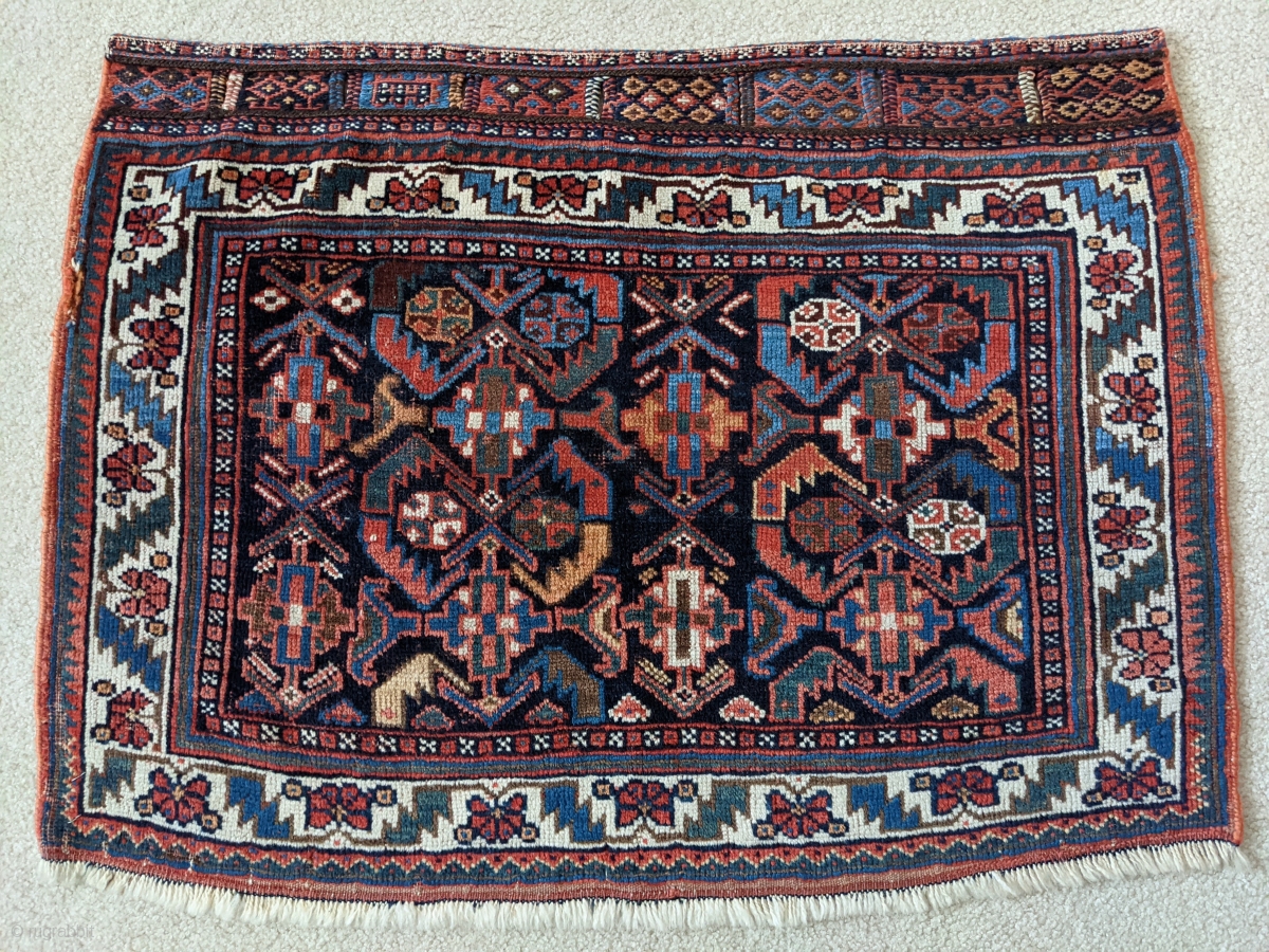 Antique Afshar bag. 2ft1in x 2ft8in. Great design on a deep indigo field. Wonderful rich colors throughout and the sumak weaving on the top of the bag is in perfect condition with each panel a different design.