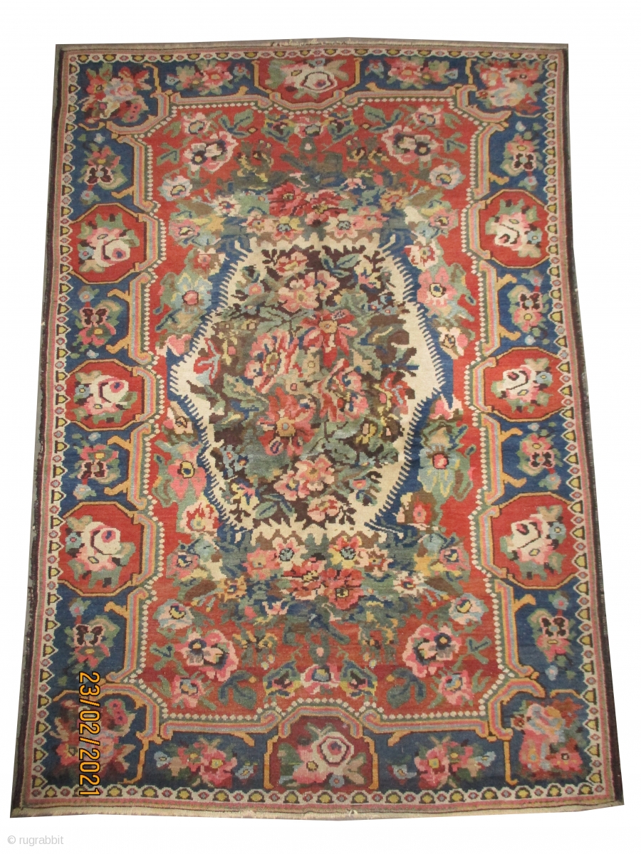 The black knots are oxidized, the knots are hand spun wool, gull-frank design with European influence, certain places the pile is uniformly short, in good condition, the background is rust, the center medallion is ivory with indigo, the surrounded large border is indigo, high standard quality.