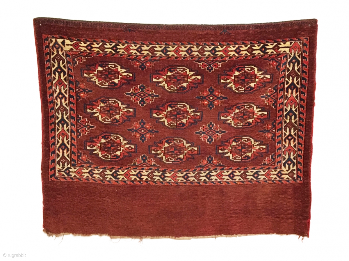 Antique Yomud Chuval. 3rd Quarter 19th Century. 9 Gul field arrangement. Erre secondary gul with tuning fork border. Very good condition considering age, reselvaged. 7 colors. 2’10 x 3’7. Delicately hand washed.