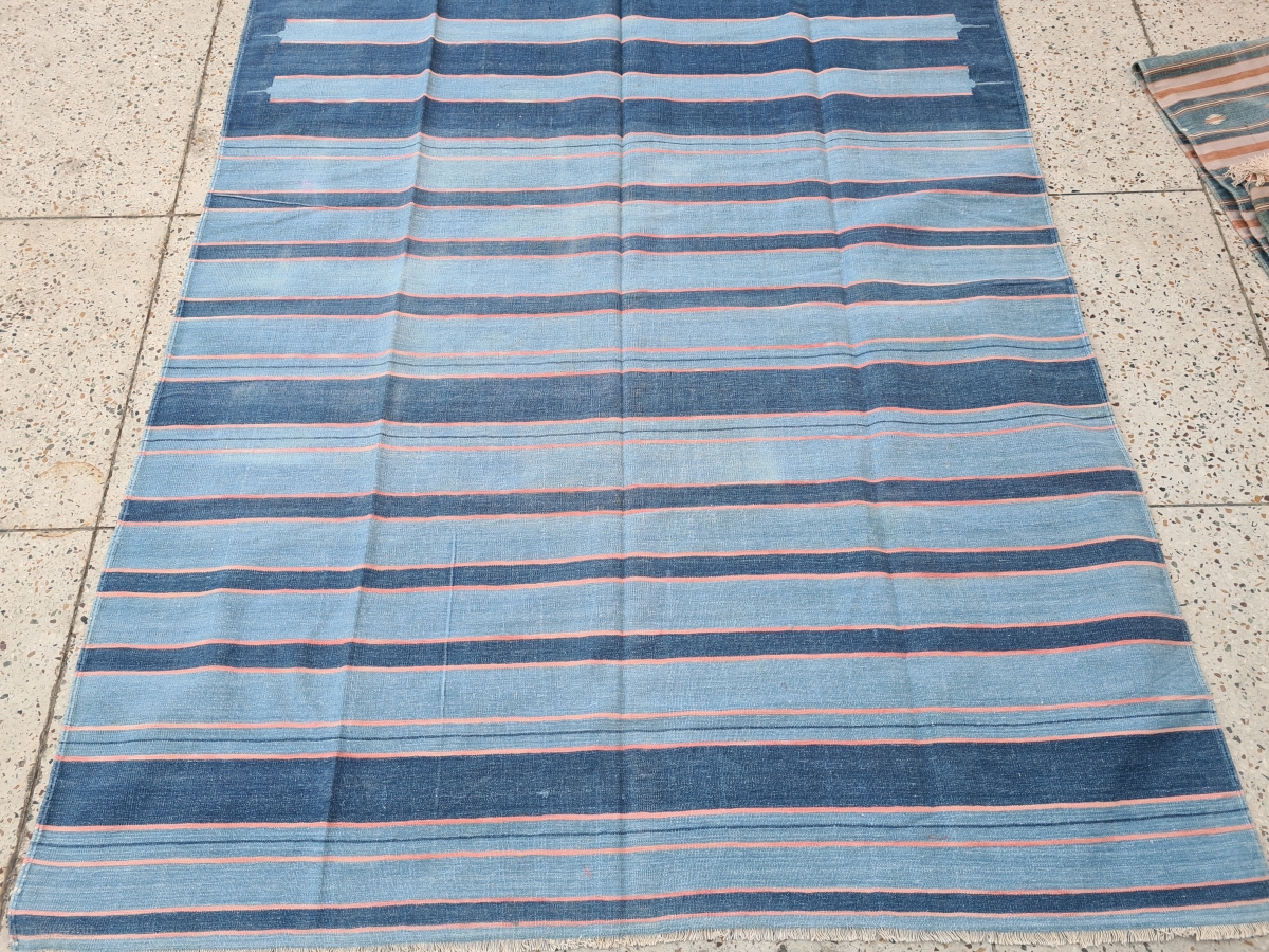 Indigo Blue,Jail Dhurrie(Cotton) Dark Blue-Light Blue Colour with double minaret striped Dhurrie.From Bikaner, Rajasthan. India.C.1850-70.Its size is 166X430cm (Large Size). Condition is very good(20210301_174557).