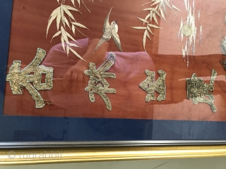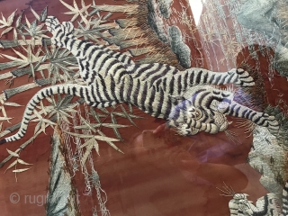 In the Qing Dynasty, the red satin land was embroidered with tiger down the mountain, while the red land was embroidered with mountain, bamboo forest, tiger, bird and other things. In the picture, a tiger pours out of the mountain forest to meet another tiger in the mountain stream. In the upper left corner, Pingjin embroidery is used to highlight the theme of "a tiger in the apricot forest". The outer frame size is 156 * 89cm, and the embroidered core size is 123 * 71cm. Some parts are off-line. It is recommended to mail without frame.