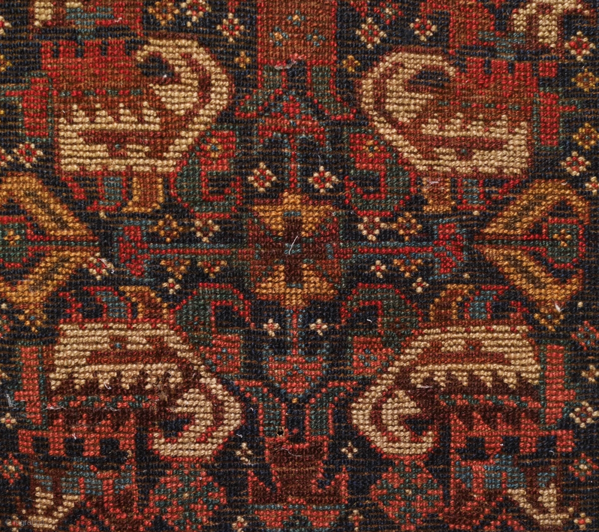 Khamseh Bag Face, Late 19th Century. Silky soft wool. Inward facing boteh design. There is a bit of a tear on the right side stitched up to keepit stable. 49 x 47 cm.