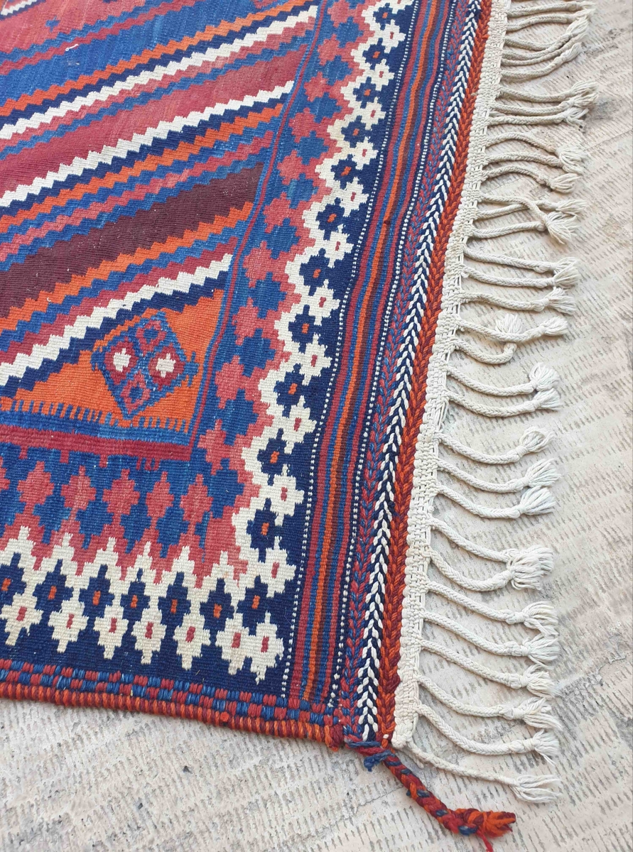 This is an Afshar kilim from Darab city , Darab is a border city between Qashqai's area and Afshar tribe area , there are similarities between Qashqai designs and Afshar traditions in kilim weaving. This kilim owns two massive diamonds just like typical Qashqai kilims , multiple borders makes this kilim looks distinctive, warps are made of cotton and are tusseled perfectly , two endings are ornamented with kilim weaving , just like most of Afshar kilims have this type of endings. Also edges are twisted just like afshar kilims and sofrehs.