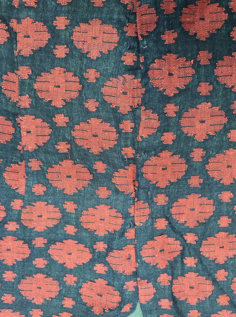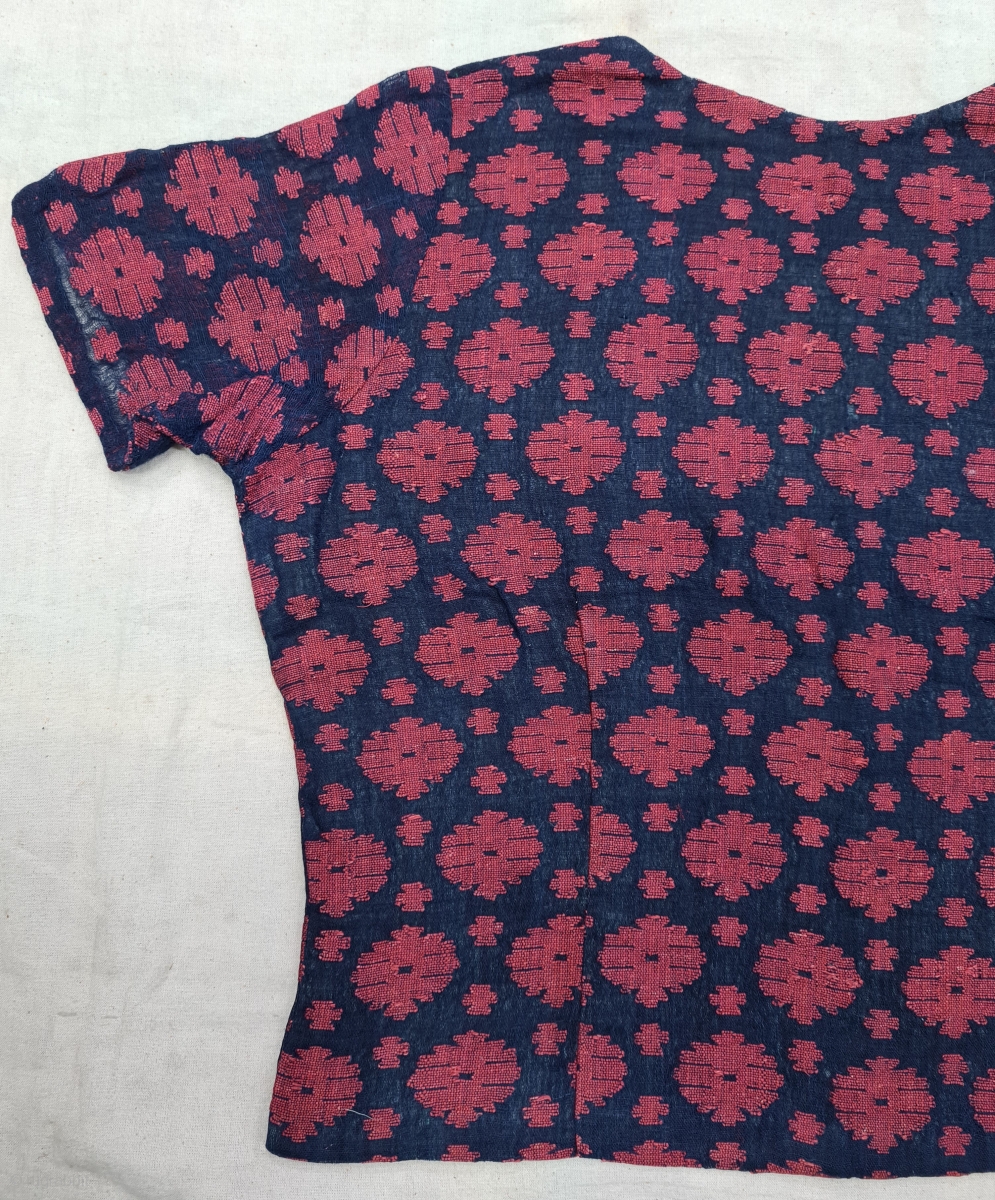 Indigo Blue Dhakai Jamdani Blouse, Cotton with weaving From Dhaka District, of Bangladesh. India. Jamdani was originally known as Dhakai named after the city of Dhaka, Jamdani is a hand loom woven fabric made of cotton, which historically was referred to as muslin.C.1850.Its size is 42cmX42cm(20210406_164404).