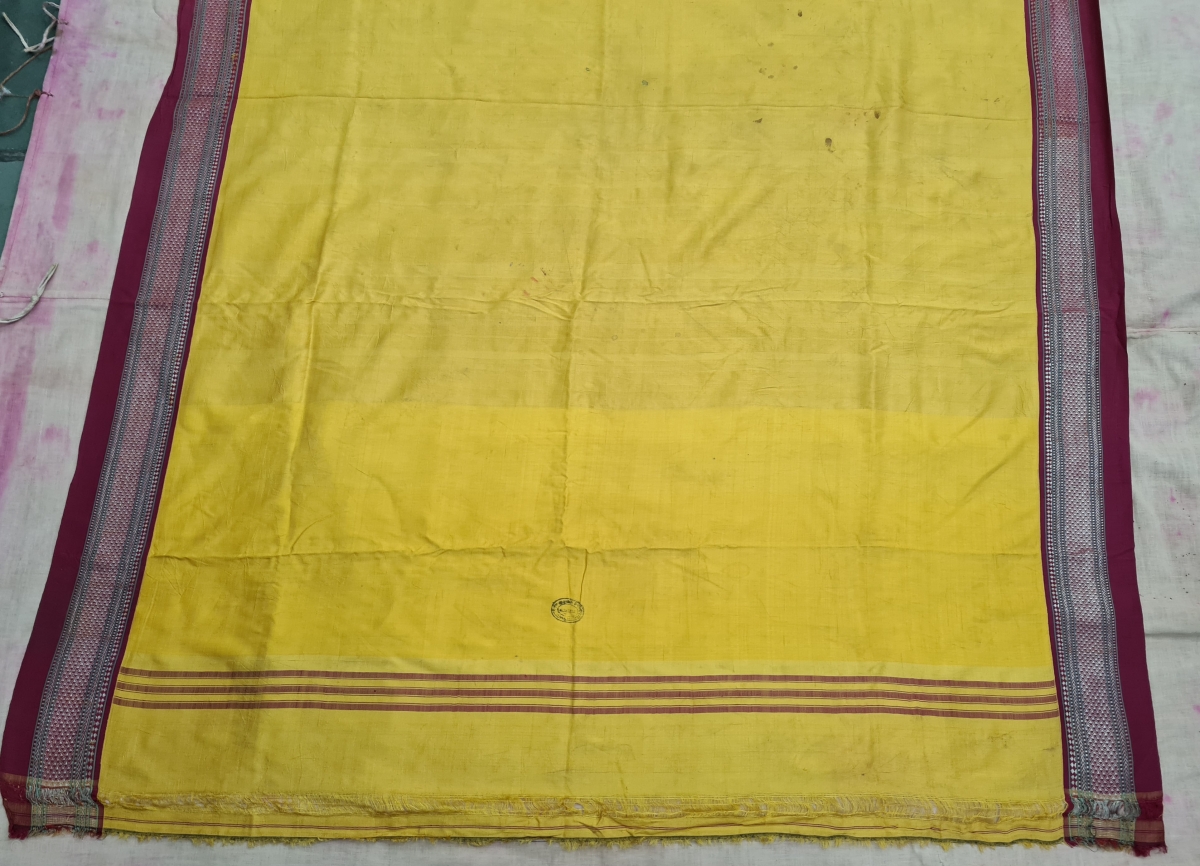 Pitamber Plain Weave Pooja Dhoni Double Pallu (Pallov)with Turmeric Yellow in the middle, ,It’s an Silk and zari weave Dhoti. This type of Dhoti is named after the Paithan town in Aurangabad Maharashtra state of India. India.C.1900.Made from very fine silk its size is 118cmX365cm.